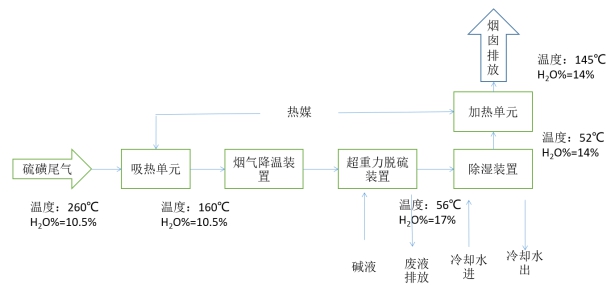 焚燒爐焚燒后的260℃煙氣先經(jīng)過消白煙換熱裝置的煙氣取熱單元降溫到160℃后進入超重力裝置進行脫硫。